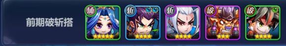 前期:甘宁、牛头、杨戬、宫本、大乔 分别对应 【破】、【破】、【斩】、【斩】、【辅】