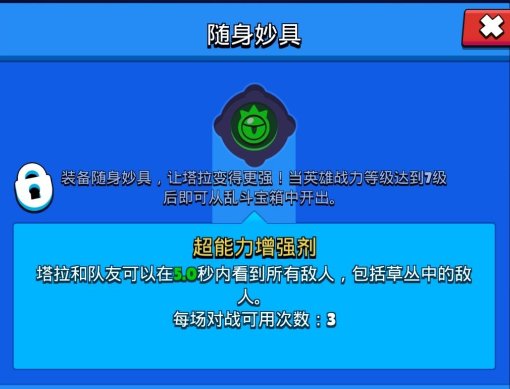 塔拉:T2,给友方提供全图视野,包括隐身的,持续五秒。效果强力,某些图特别适用,但是在很多图略鸡肋,值得入手,草图上分利器。现在这个版本出现有bug,双人模式中,塔拉开妙具,全部人都可以得到这个视野,是的,全部人,这样子的话里昂和沙迪将无所遁形。