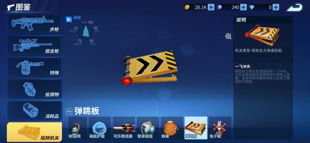 像上面那个表演的飞天,就是使用了弹跳板这个道具。弹跳板最有意思的地方就在于,站上去的瞬间就把人垂直弹起,到了一定高度自动开伞,然后玩家就可以凭借自己精湛的跳伞技巧控制落地了。