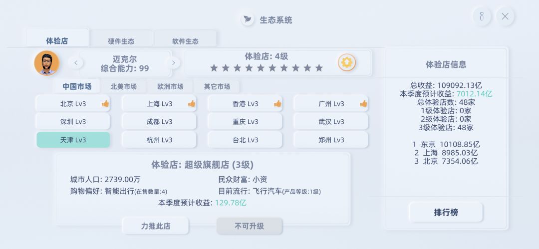 后期手机最多就是600-900亿利润(除了几个亿粉丝的肝帝),生态是后期最赚钱的方式,通过升级体验店和生态来获取星星,保证每一个硬件生态都研发,通过不断收购公司解锁新的硬件生态扩大销售规模,收购公司-研发硬件-赚钱-收购公司,形成循环。推荐优先升级以下体验店,目前我最赚钱的体验店仅供参考