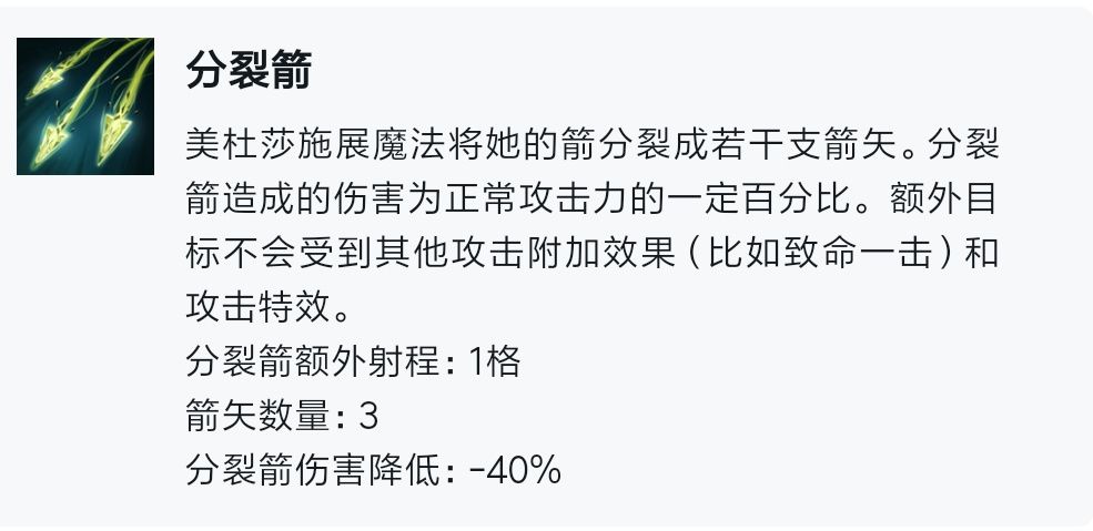 这个是美杜莎自带的技能,增加输出,提高回蓝。但不能继承攻击特效,包括但不限于冰眼,暴击,电锤。不过在触发猎人羁绊的时候分裂箭同样触发。