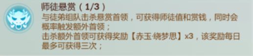 细心的玩家在师徒界面可能早就发现了这一项改动,原先版本中师徒一起打悬赏首领是不会有师徒值和赏钱奖励的,只有打副本里的首领才有,而现在新版本中,不仅每个首领都会给予15赏钱还有概率触发额外首领。
