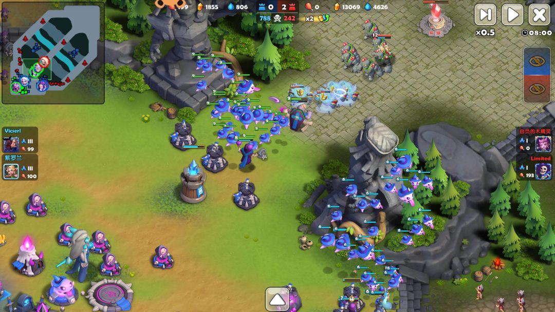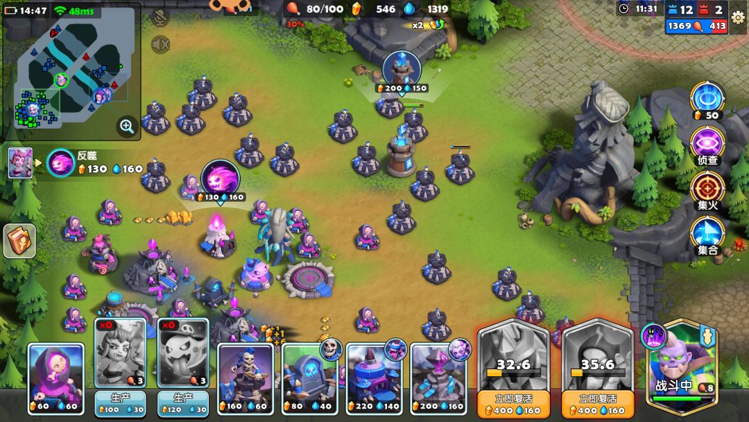 此时,清兵所得资源和双矿资源会使资源大量溢出,金币和泉水大概在1000~2000,别愣着,保证兵力满人口情况下,在女王附近大兴土木——造箭塔。