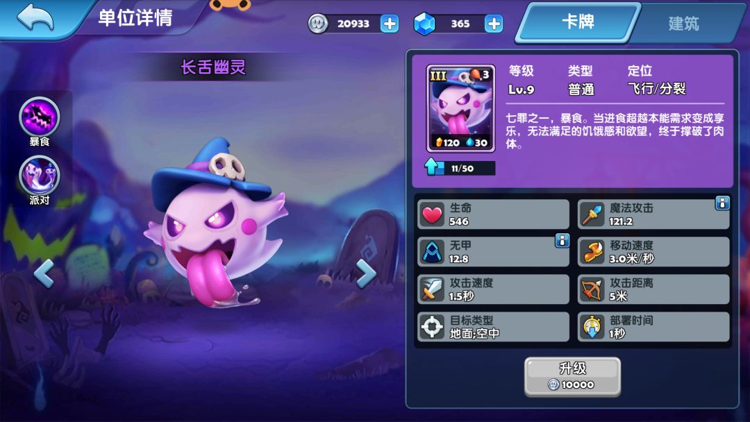 暴食和派对可以有效提高长舌幽灵的续航能力和输出,120金矿/30原液的价格和3人口保证了长舌幽灵可以大数量同时输出,保证了可以尽快清理掉一波部队进行其他路的协防。