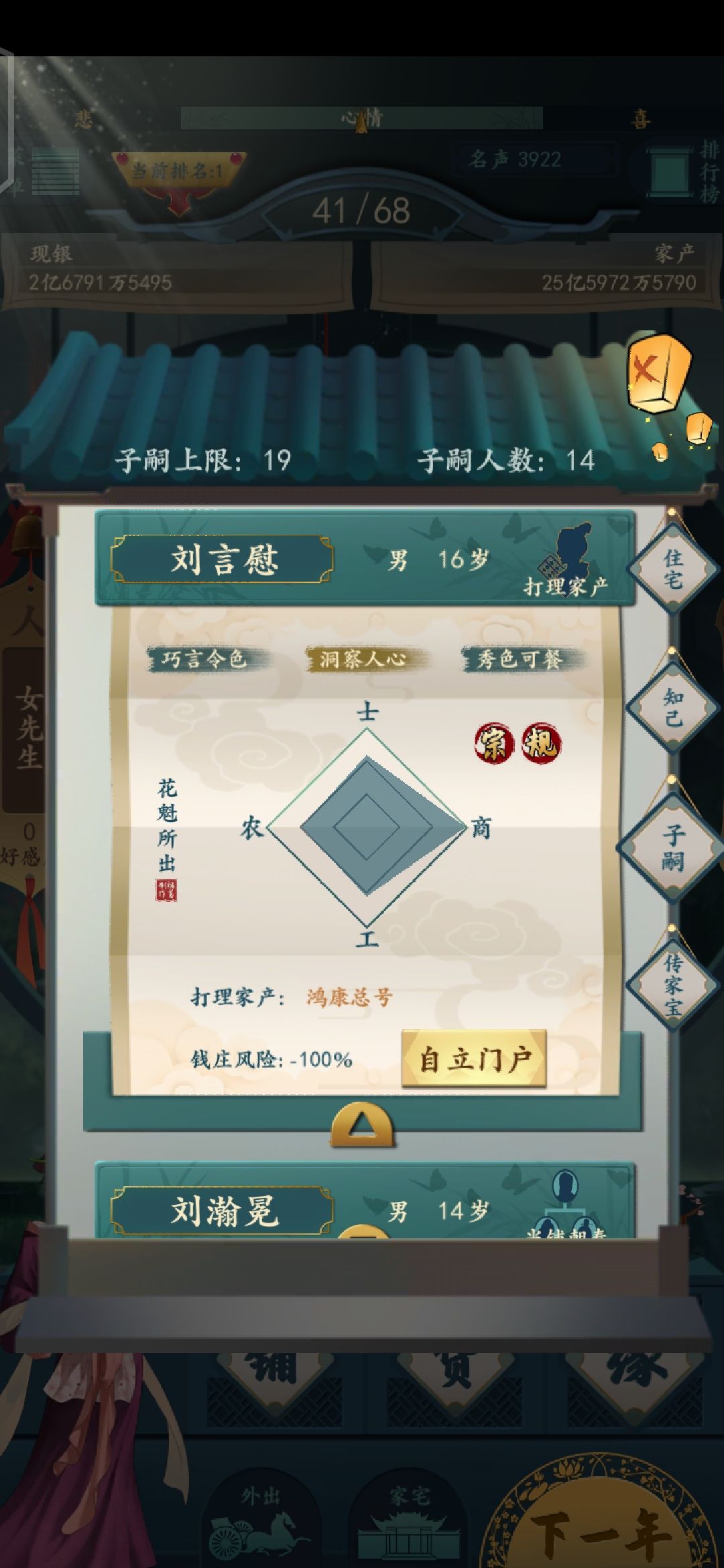 住宅的话就建议家族世宅 加100最高属性。还有一个豪,如果宴客刷出来说书人了直接起飞,钱庄基本不会坏账