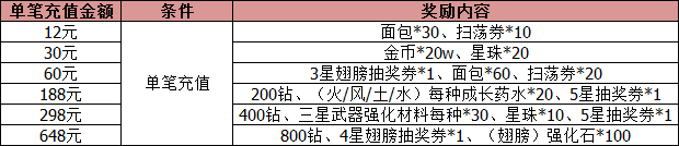 活动内容:活动期间,单笔充值对应额度即可领取对应的礼包奖励,每项奖励只可领取一次哦。