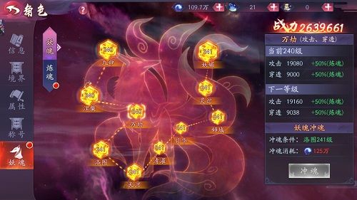 在妖魄功能里,玩家可消耗魂源冲魂,提升魂位的妖魄等级,增加固定属性。注意!玩家要按照魂位次序依次进行冲魂,每个魂位都有特定的属性和冲魂条件。