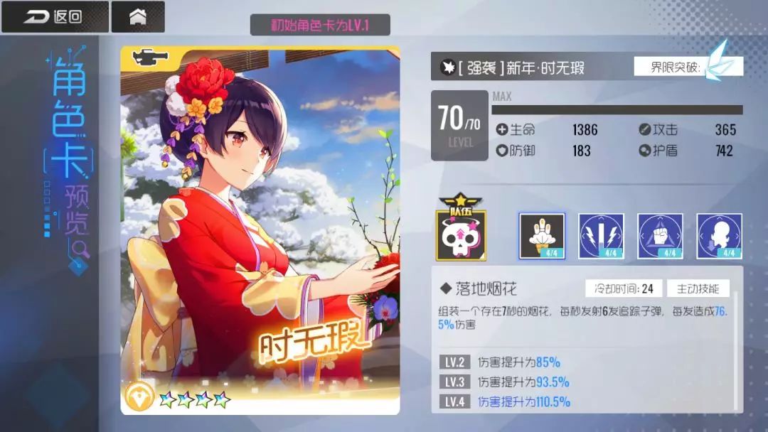 新年·时无暇,作为四星强袭卡兼具有些的伤害能力和破盾效果,适合在队伍中补输出和气绝伤害,对克制属性表现更为优异。由于被动二被动三对一般boss相对无用,觉醒优先度较低,冬泳活动有防疫材料剩余的店长也推荐优先培养。
