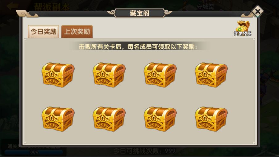 1.每一章副本的敌人被击杀后,所有帮派成员都会获得副本宝箱。(点击藏宝阁,选择一个箱子打开,里面的东西就是属于你的战利品)