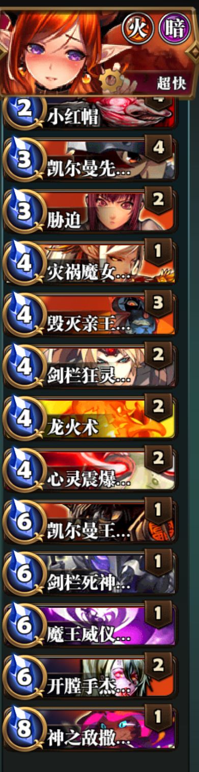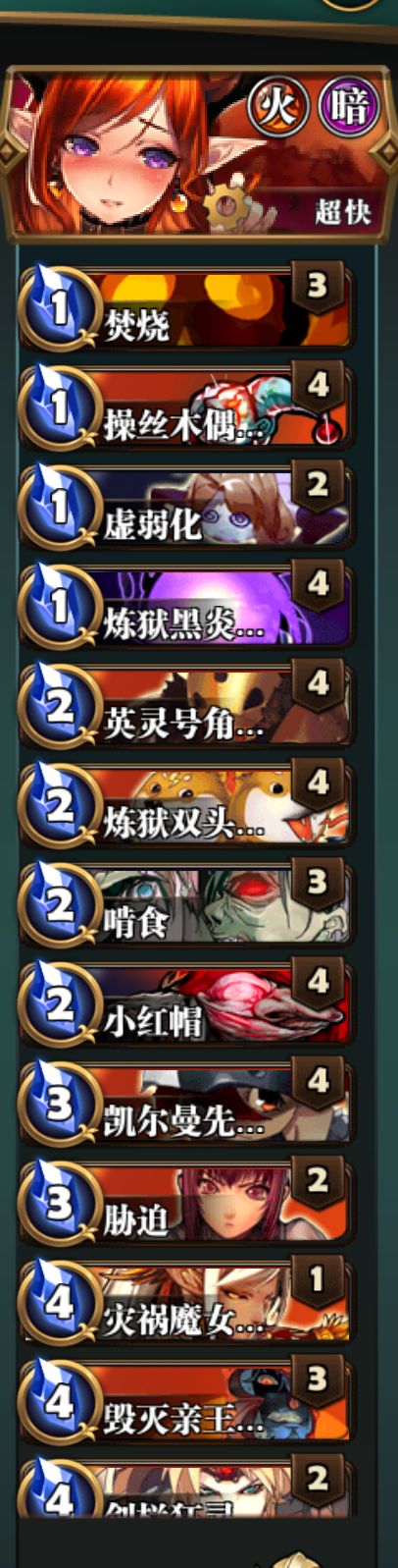 炼狱黑炎――1c方便走位,3点伤害可解牌可打脸,副作用可以配合恶魔史莱姆和快感魅魔(虽然这俩我都不带)简单但有效。满编