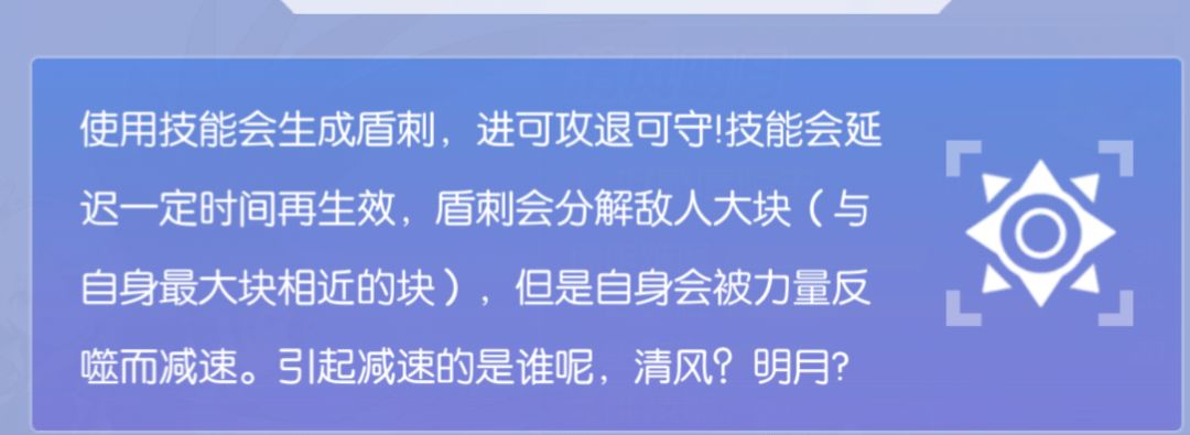 首先考虑到阿肯前期发育慢的缘故,开局后先使用1919辅助阿肯,让清风明月自己发展一波(或一起发展,视情况而定)发展到后期,阿肯的大小至少要是队伍中第二大,使用技能前,先仔细观测对方及周围有无减速或束敌型英雄,如果没有先开启技能三秒钟左右后直接吃加速方块(一定注意时间把握,单人也是这样),向敌人方向移动,消减敌人,对方是减速或束敌型英雄话,那么还是相同玩法,不过如果失败的话,清风明月就要及时开启技能避免全灭。最后关于其他阵型,进攻型英雄(清风明月)可以就自己喜爱更换适合英雄。