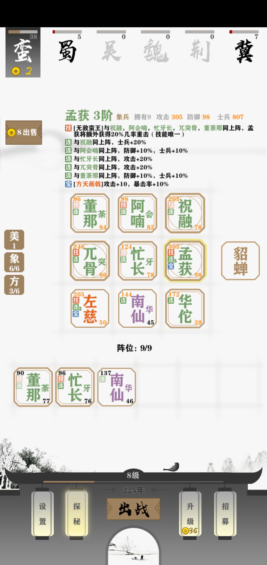 蛮族还是很弱,底下的格子不够合,要合的人太多了,前期猥琐的飞起,很容易翻船!最主要是优先合出三阶孟获。有曹操或者吕布。把他们的装备转给孟获!我图中就是孟获拿着吕布的方天画戟!然后第二个主要三阶是祝融,奶妈主要是左慈三奶组合,左慈放最左边优先奶人。主要输出是祝融跟孟获。成型以后还是不虚的。