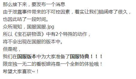 文中表示,因为图片“泄露”事件带来的不可控因素才导致游戏长时间的跳票。“《宝石研物语》开始预约至今,所承受的期待已经远远超出了它当前的体量”。而因为国内政策的原因,“《宝石研物语》中有2个特殊的动作,将不会出现在国服的版本中”。为了补偿国服玩家,“在国服版本中为大家准备了国服特典”。