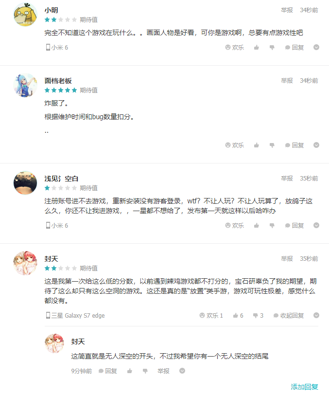 虽然官方早已宣称本作只是一款“放置游戏”,但依旧是难以掩盖玩家们对如此空洞的游戏内容的失望之情。仅凭点击与阉割版的Live2D无法填补玩家们在这3个月里对这款游戏的期待。