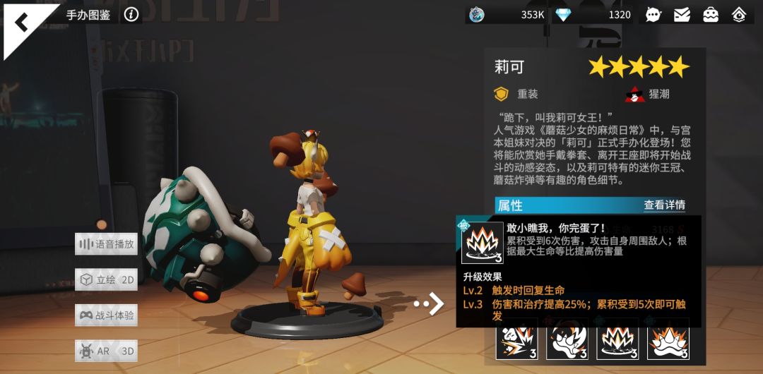 首先从重装说起:重装在ssr里面比较少就两个,一个莉可一个杰斯,这两个手办up主推荐莉可。因为莉可是集合了嘲讽、减伤、回复于一身的完美体,更重要的是她的技能跟杰斯比除了第二个被动以外不需要看脸,是固定触发的。完全不用担心脸黑触发不了的问题。