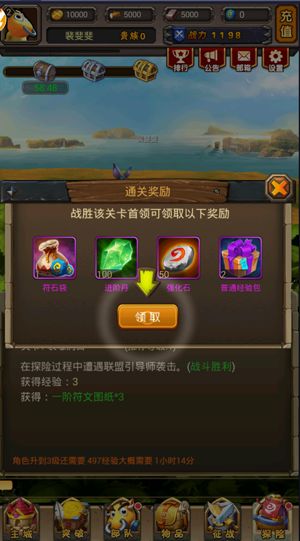 战斗胜利后获得丰厚奖励,奖品多种多样,符石、经验包、进阶丹、强化石应有尽有。