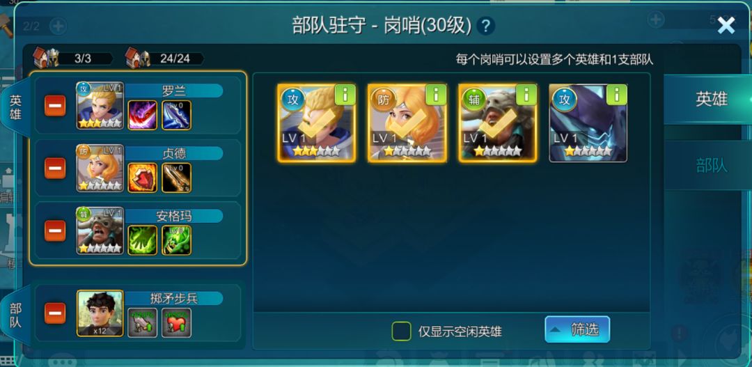 没错,这就是为了让战斗更加激烈,策划大大们放开了一个岗哨最多可以驻兵3个英雄!!!