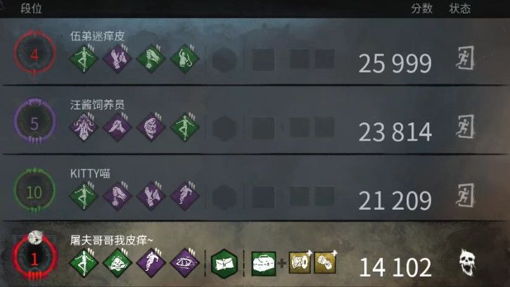 面对某屠皇(走地)的结算图车队必带技能分析:魂牵梦绕:一人魂牵=全员魂牵。如果现在还有人觉得魂牵是用来遛屠夫勾引1212嘲讽的,那就太年轻了。魂牵是用来通过定位屠夫位置和行为,来掌控全局确定战术和队友行动的。 (单排魂牵的技巧我会在以后单排人类技巧里讲解)怀表:必带一个。针对和巡逻可以派上用场。你问我贴脸守怎么办?我会在下文具体讲解!至少两个自摸:屠夫不守由医疗兵摸,守或者针对那也没时间摸,当然面对一些残局没自摸也很拖节奏,我的推荐是带3个自摸,有经验的那个可以不带,加一个保命技能(比如咬根)。