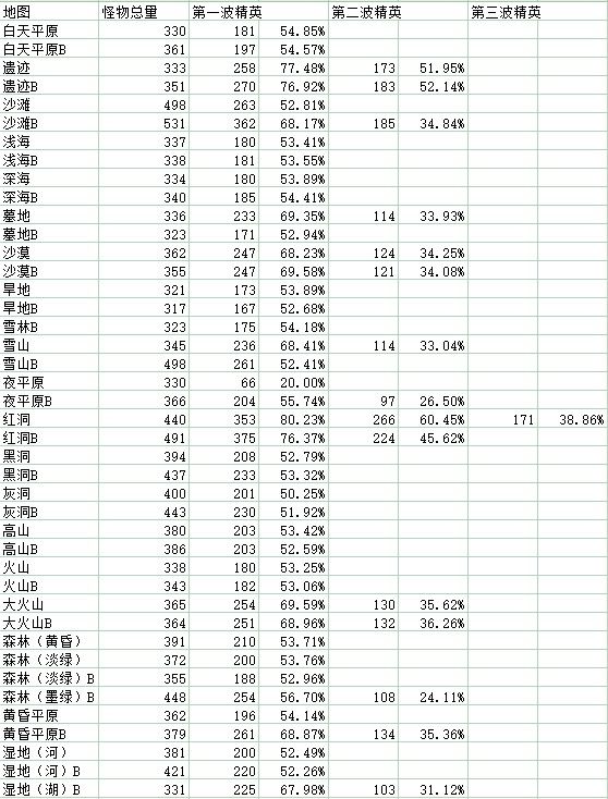 细心的小伙伴会发现每一个关卡在某个时候会出现一串文字提醒你剩下多少怪物,而且同时会出现一波带霸体(无法击退)且血量、移动速度被加强的怪物(精英怪)。在我们利用卡千斩CD打Boss的情况下,Boss对我们的威胁实际上已经变得很小,而这些精英怪处理得好不好就成为了我们冲层过程中会不会扣血的关键。俗话说得好,知己知彼方能百战不殆,只要我们找出精英怪的刷怪位置,那这些精英怪对我们的威胁就会大幅度降低。以下是我测出来的每种类型的地图(带B为Boss关)精英出现的位置,只要怪物的总数量降低到这个百分比以下(可能会有波动)便会出现精英怪。根据这个百分比我们在进图前就可以预料到什么时候会出现精英怪,只要注意右上角怪物数量快降到该值时保证自己有千斩CD快结束了就可以在它们刚刷出来的时候送它们上路,这样一来就可以降低我们掉血的风险