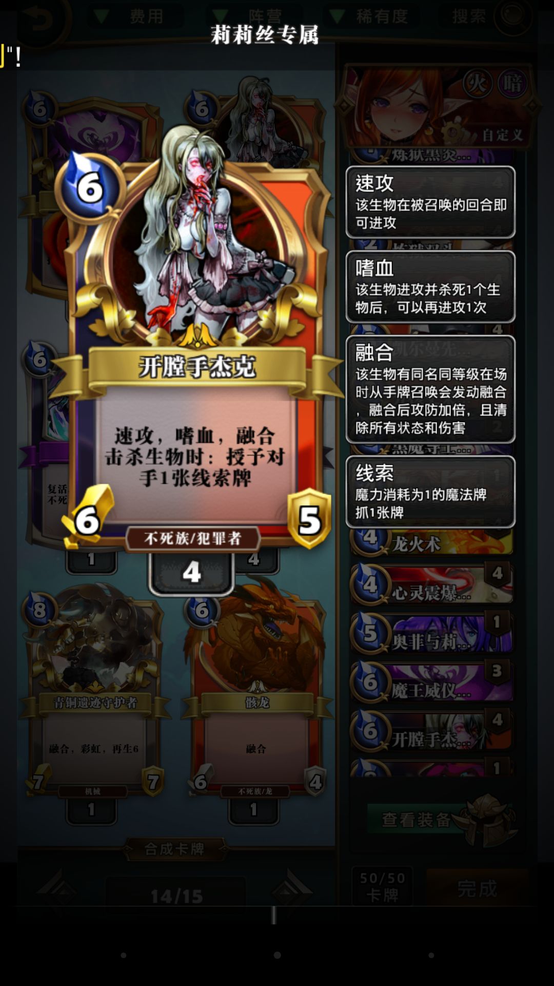 开膛手杰克,是后期翻盘的关键斩杀牌,优秀的异能和合格的身材很容易出其不意的锤脸。是莉莉丝卡组中为数不多的必带橙卡之一,有条件的小伙伴务必带满;