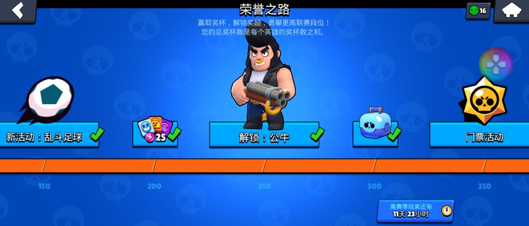 本期攻略的主角是公牛,如果前期没有抽到拳王的话,就应该是我们得到的荒野乱斗中第一个坦克类型的英雄。公牛是荣誉之路上的第三个英雄,总奖倍数达到250杯即可解锁。