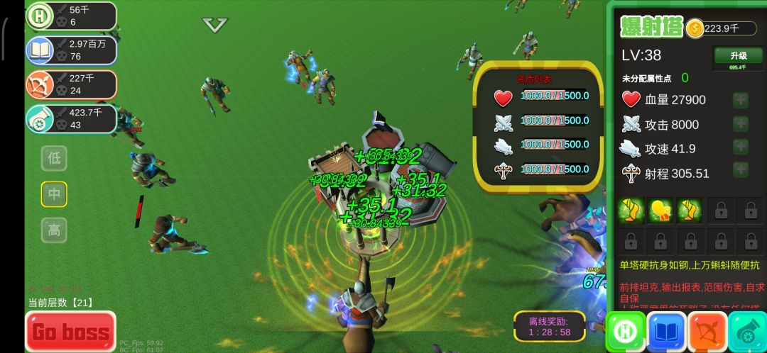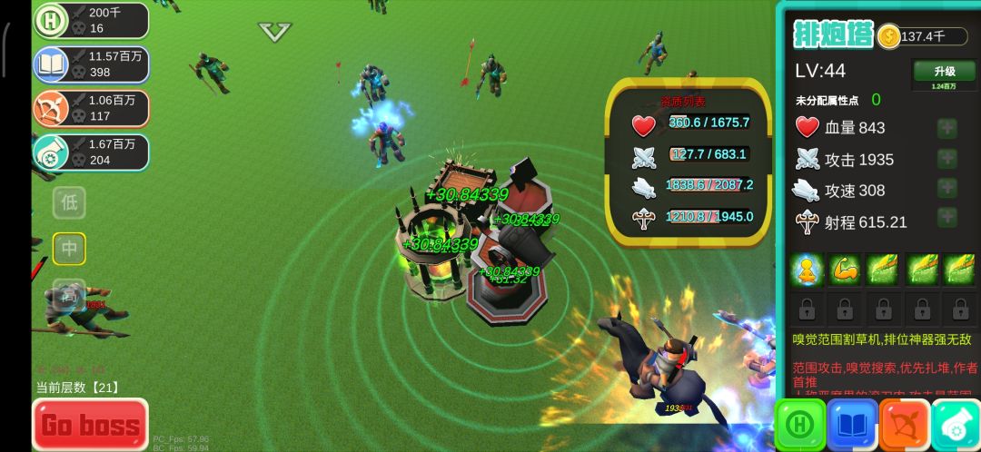 然后这时候大概电塔30级(5000左右攻击600不到范围),半藏25级(1000攻击➕高额攻速高额范围800左右),射爆25级(25000➕血),排炮开始养:目标300左右攻速➕600左右射程➕1000多攻击力➕3个萃毒