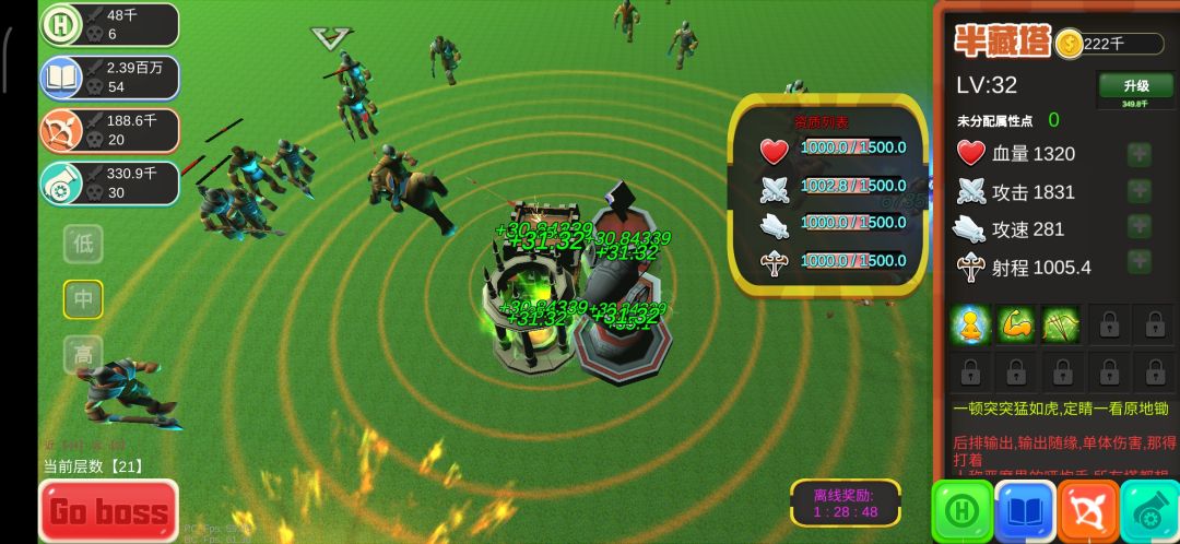 3级出现商店和交易行,看完视频优先买强健,散射,淤泥这些,强健给半藏和排炮,散射给电塔,有多的给半藏,淤泥给爆射(每个塔先打一个最需要的,让后先不打其他的,先用着)然后边看视频边升等级,打完这些技能会很猛,根据情况开始打boss(这里说一个不死方法,感觉快打不过就强退,然后重新加载)