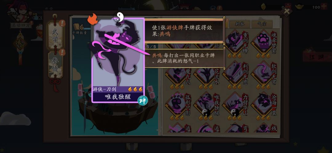 4.打出唯我独醒,然后优先打出低费游侠牌,然后非临时牌的追步,然后临时追步,可以通过过牌,重复以上步骤(如果有魂牵梦绕,还可以不停刷怒气)
