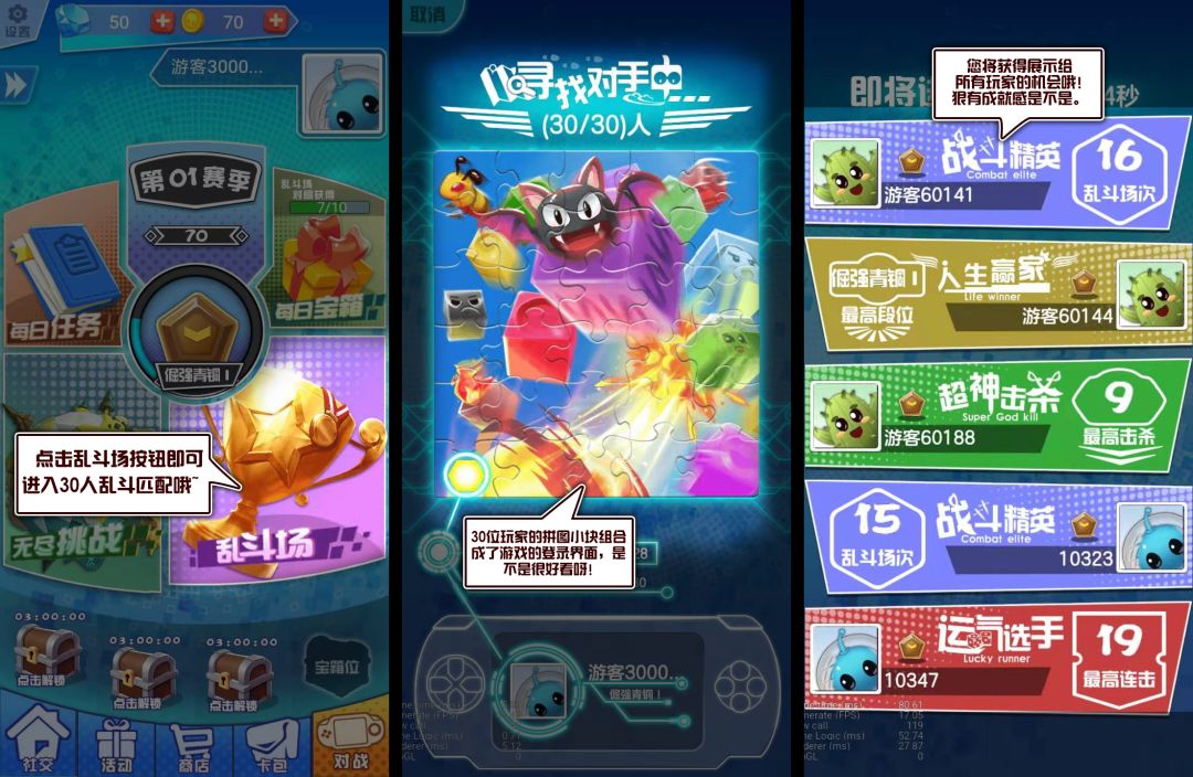 只要点击乱斗场按钮即可进入30人乱斗匹配哦,30位玩家的拼图小块组合成了游戏的登录界面,是不是很好看呀(我就是这么认为的,嗯嗯),匹配完成后还有10秒钟的巅峰时刻展示,让你知道这局中的高手是谁,段位等级越高,您将获得展示给所有玩家的机会哦⊙∀⊙狠有成就感是不是。