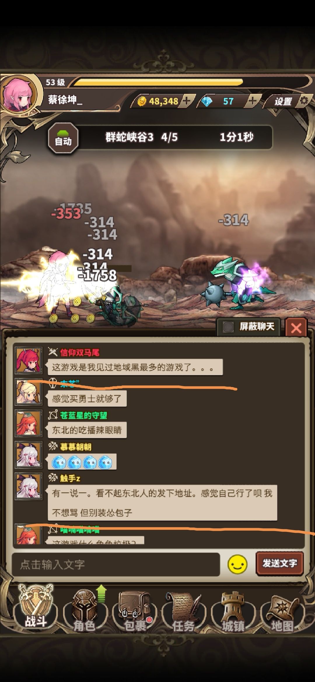 从东北人黑到广东人,从河南人黑到浙江人(大部分太难听都没有截图),这群地域黑在游戏里带节奏带的我是目瞪口呆,一个好端端的挂机休闲游戏变成了对骂,总有一两个人开着脚本每过一分钟发一条引战言论带节奏,本来是一个挂机刷图聊天的轻松游戏,硬是逼着我把聊天屏蔽了,客服晚上以及早上九点之前也不上班,让这群人觉得网络就是法外之地。我觉得游戏除了优化,还要加大言论监管力度,优化游戏能带来大部分玩家,绿色游戏环境更能留住大部分玩家,本来就是一个休闲放松的游戏,打开界面就是带节奏,搞港独,搞对骂,真的很影响游戏体验。