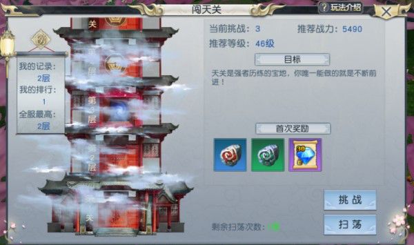 3、玩家每天可以通过扫荡功能,快速完成已经挑战成功的层数获得通关奖励。