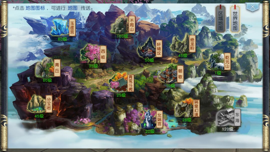 地图右边的模块可以切换当前区域地图或世界地图,方便玩家快速进行传送。世界地图中的场景开放与玩家等级有关。