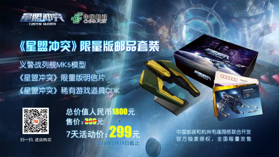 《星盟冲突》邮品套装全国限量发售,总价值人民币1800元,售价399元,现在截止2018年3月19日24时活动促销价仅售299元!