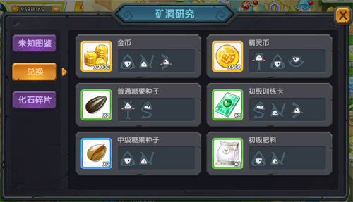 在矿洞里获得的精灵可以兑换各种资源,金币、精灵币、普通糖果种子、初级训练卡、中级糖果种子以及初级肥料等。另外有几率获得化石碎片,集齐即可获得化石精灵。