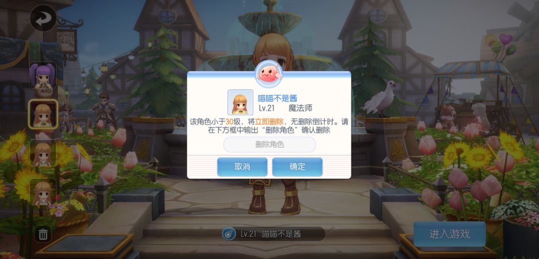 点击删除角色,会有二次弹框进行账号信息的确认,展示当前要删除的角色头像、名称、职业、等级信息,必须在玩家确认信息并自己输入“删除角色”四个字,才能进行删除确定。