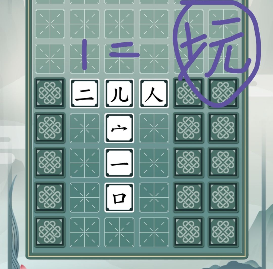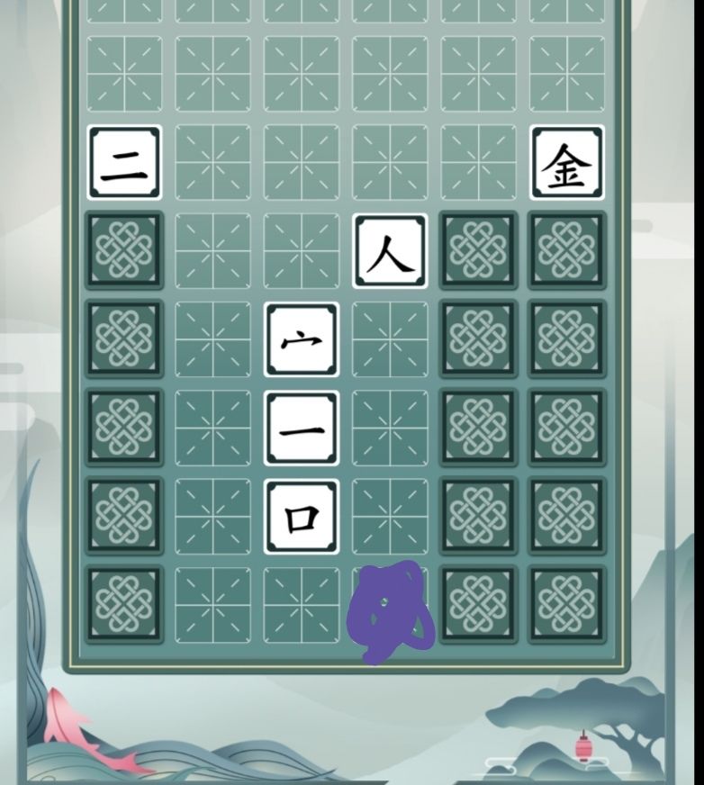 第四步:“宀”最底部堵住,然后放“儿”和“二”拼“完”