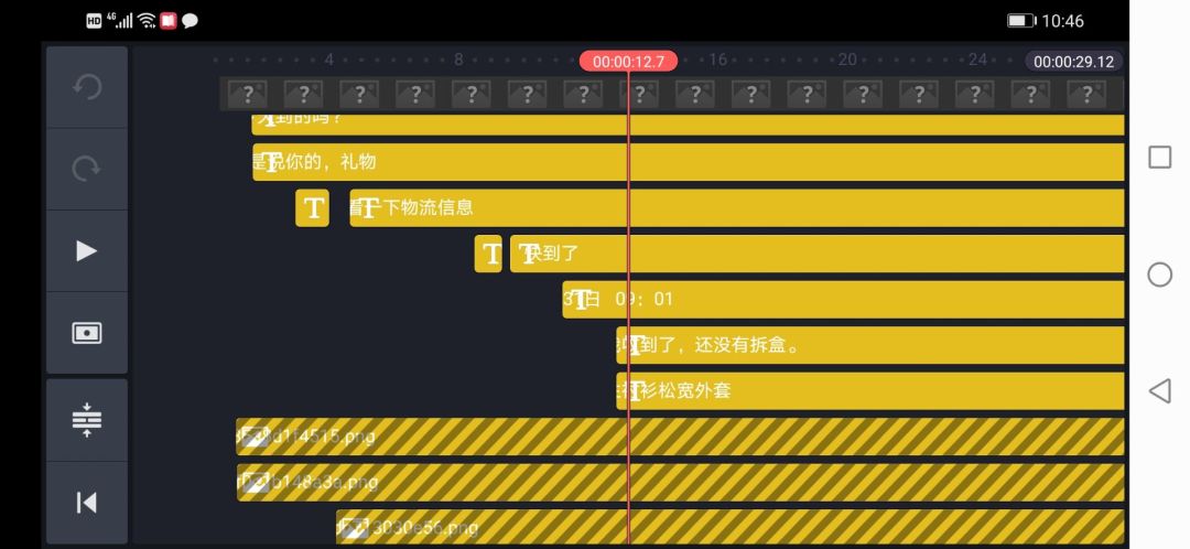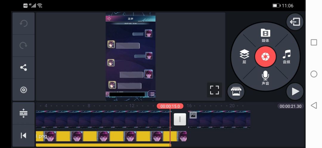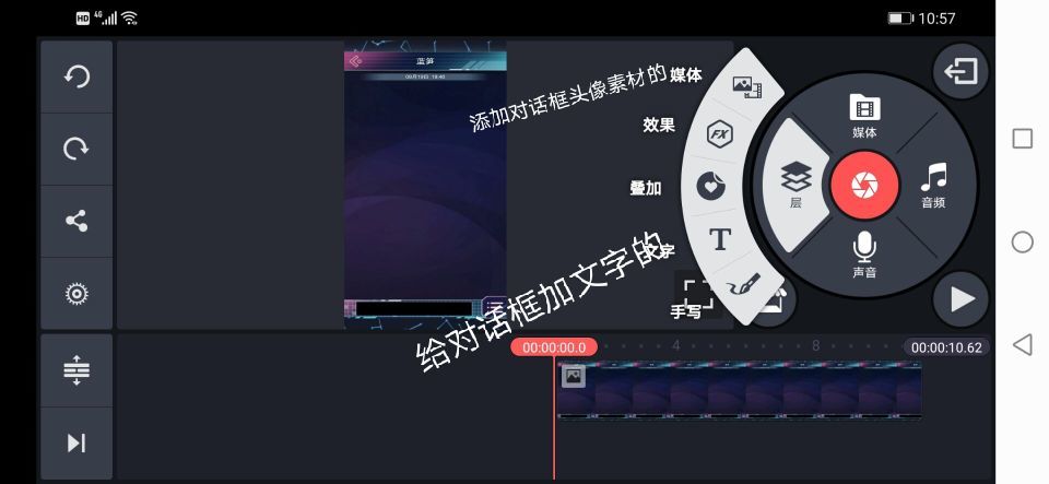 然后点击隔壁的层,(上图必看)。那些头像啊,对话框啊,文字按照顺序一个一个的放入。下面那个叫做时间轴移动的话,就会看到你的视频效果,进行调整素材出现速度。