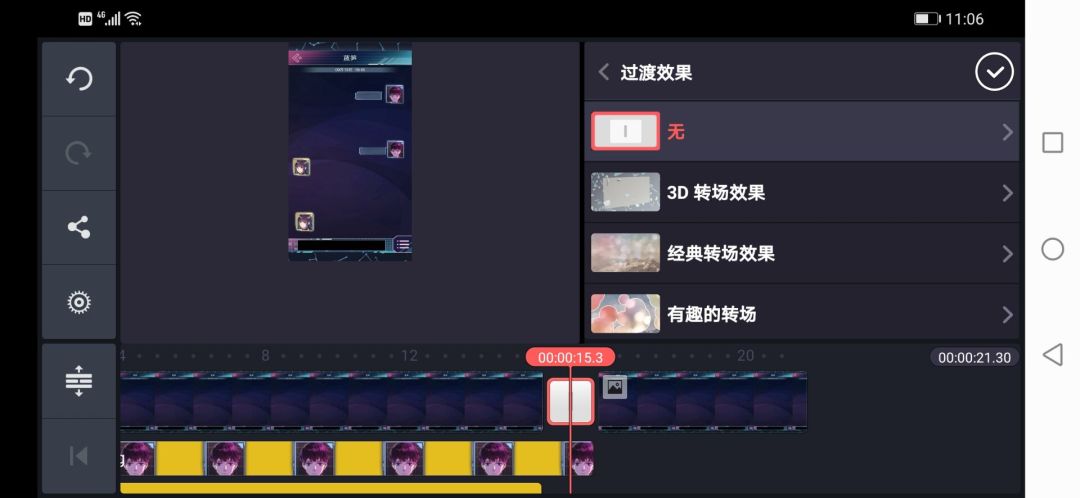 全部素材拉到24秒左右。15秒太快了。这样我们就完成一部分了,然后点击媒体,又把背景导入进去。就会出现这么一个方框,点击它添加转场特效,随便加就行了