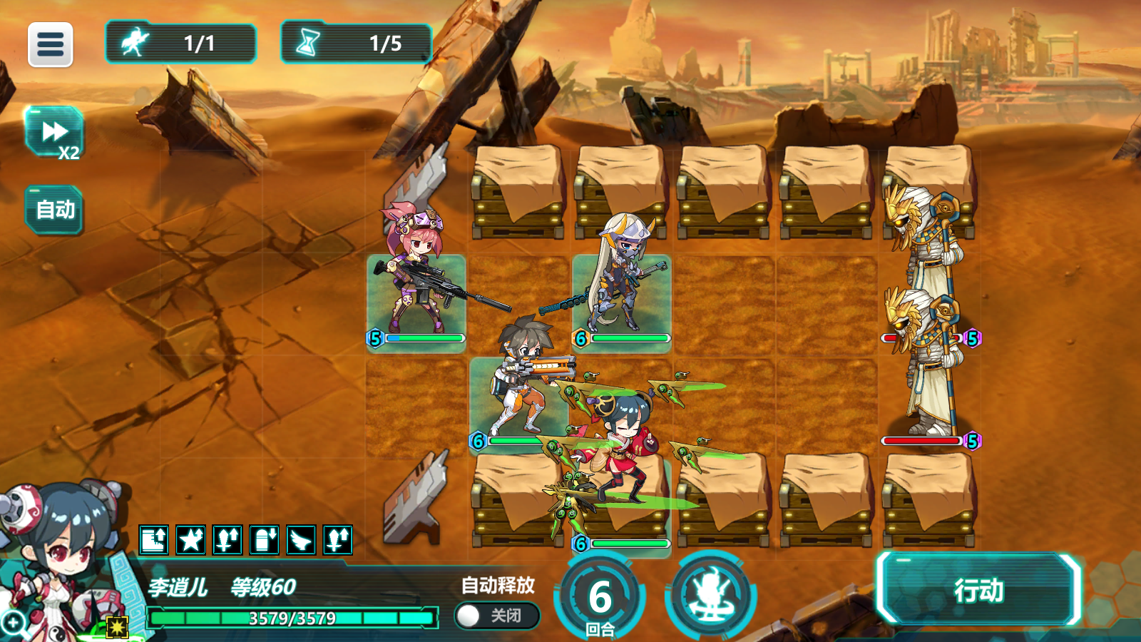 然后全程点行动就可以了,只要保证上述条件都能完成就可以在每波只漏一个木乃伊的状态下通关,若携带了轩辕则可以在最后几个回合多打几个木乃伊。