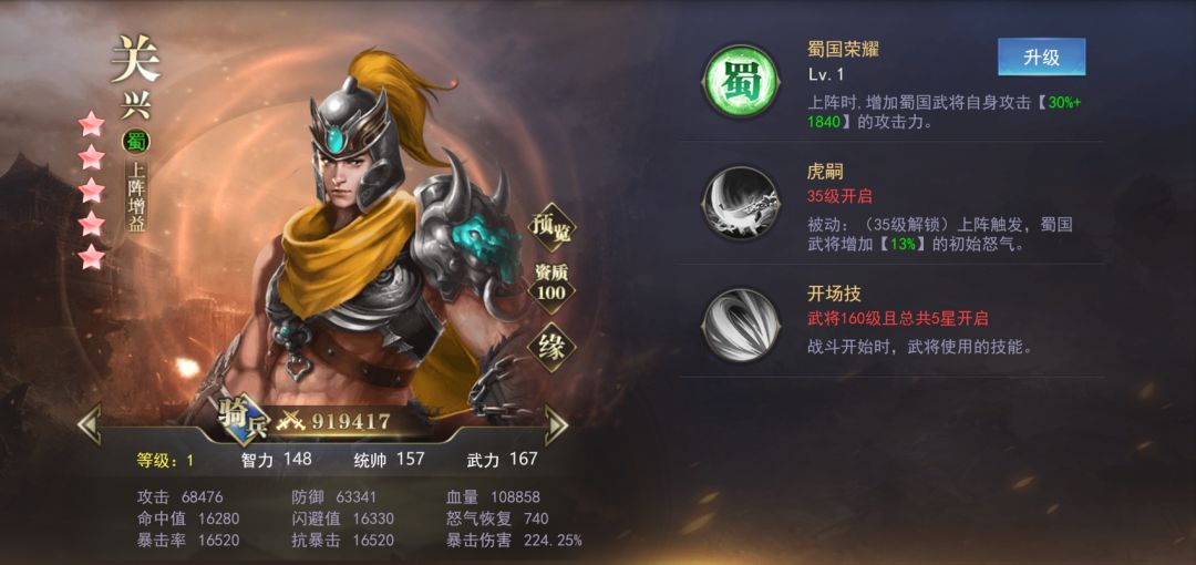 关兴是橙将,获得比较容易,属于骑兵,技能可以增加蜀国系武将攻击和初始怒气,相当于辅助,这种加buff的辅助简直是团战最爱,团宠级别的人物。