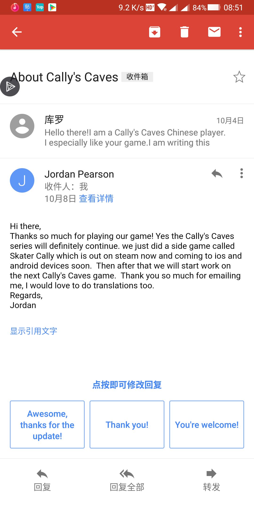 对于给游戏制作者的邮件,作者已经回复了