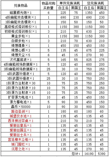 红色字体的物品为家具。和之前不同的是,武器“磁暴辉光炮”的6次兑换价格是一样的, 均为225白王后和75黑国王。