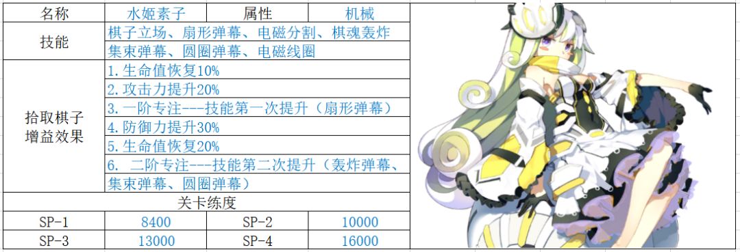 (1) SP关卡的素子技能与演习模拟中的技能基本相同,而第三颗棋子和第六颗棋子会提升素子的弹幕技能的伤害(变成紫色)。