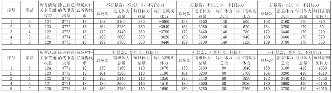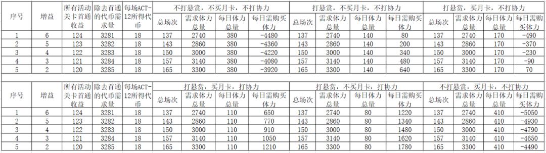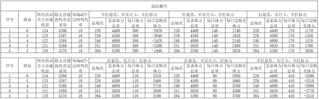 4、表中每日购买体力为负数的情况,即表示该选项不氪体力也能完成商店购买目标。