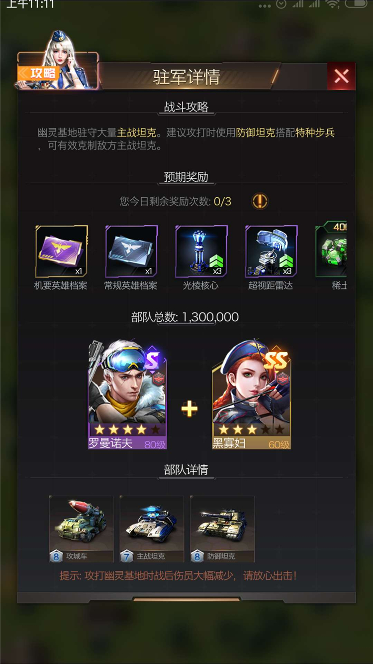 当然,从图片中我们能看到【幽灵基地】是可以和盟友集结进攻的,难度并不会成为这个玩法的阻碍,反而是一个很好的练兵场所,指挥官也可以通过点击“守军情报”根据【幽灵基地】内的部队情况针对性出兵。