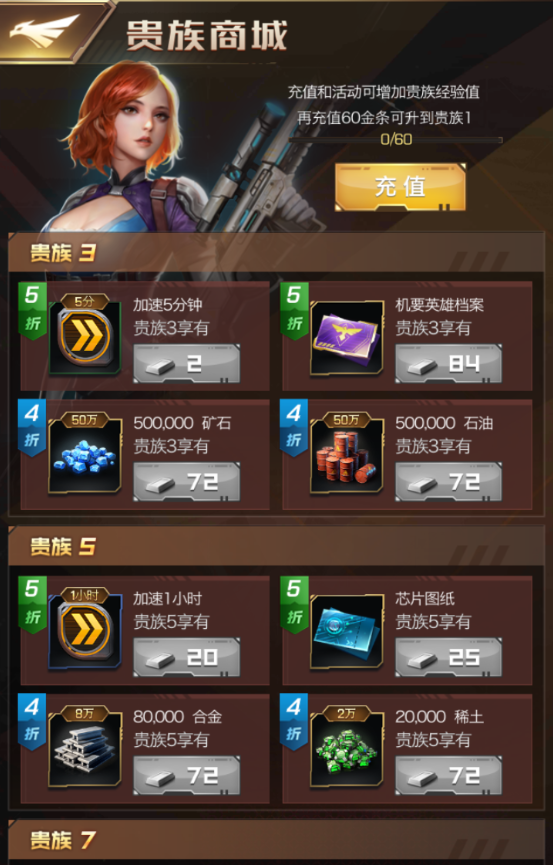 金币补给专属,提供的多为和战斗相关的稀有道具,比如增加部队攻防、行军速度的道具和抽取英雄、芯片的【机密英雄档案】和【芯片图纸】等。