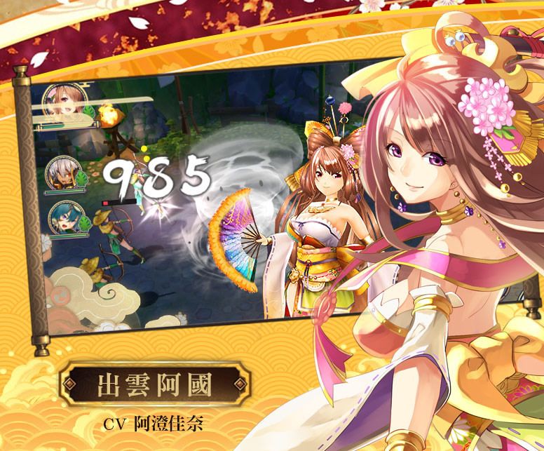 出云是地名,阿国是她的名字,出云阿国有「出云大社的巫女」之称,被后世公认为日本歌舞伎始祖,在《战国明日香》游戏中的阿国,同样有着轻快舞步般的战斗动作,不论是小技能亦或奥义都非常华丽,奥义技「樱花乱舞」宛如真正的歌舞一般,使用舞扇在漫天樱花瓣中进行大范围的攻击,非常华美!