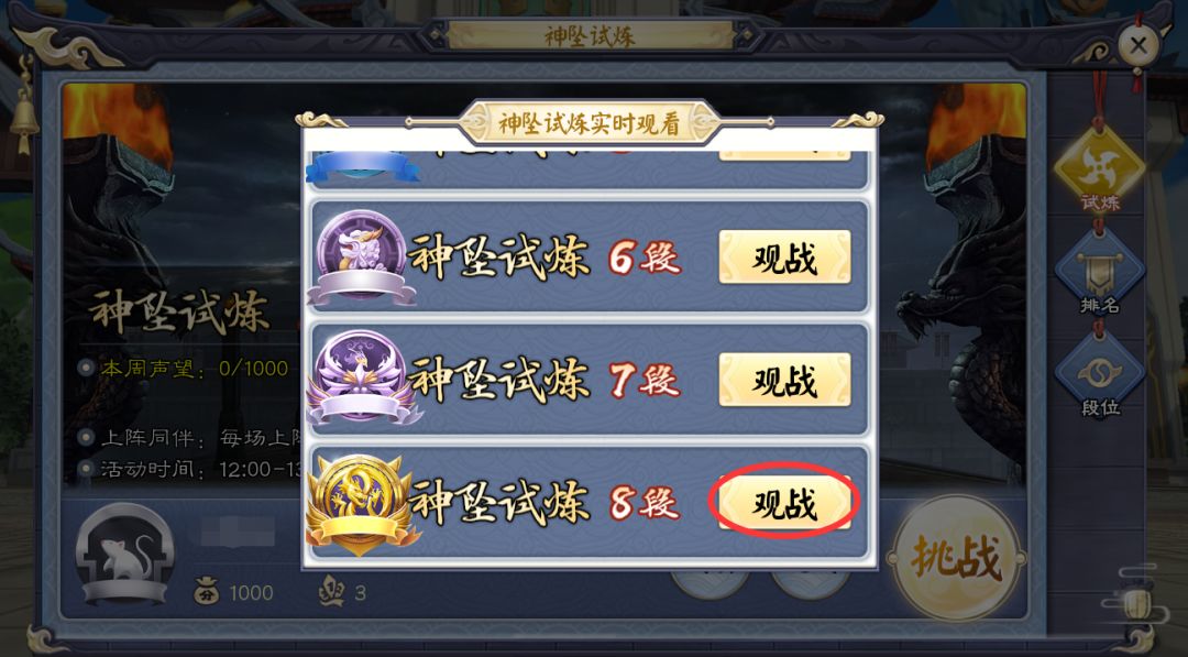 在游戏中,玩家可以在游戏主界面的“活动”界面里找到神坠试炼,也可以在主界面中爬上楼梯寻找云丹老师和破阵统领,其中破阵统领可以为玩家开启神坠试炼。但在游戏中,玩家无法随时随地地开启神坠试炼,因为神坠试炼仅在每天中午的12:00~13:00和晚上21:00~22:00开启