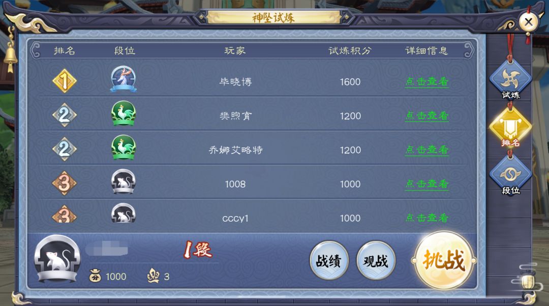 在神坠试炼的排名界面中,排名是由积分决定先后顺序的。可以从中看到排名玩家的积分、昵称以及段位。在界面的下方,有着自己所拥有的积分以及自己在榜单上的排名。