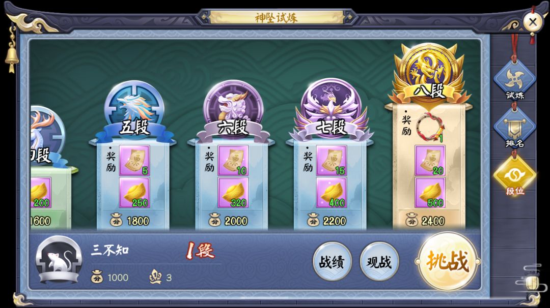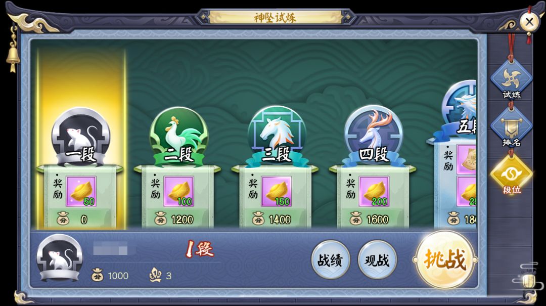 神坠试炼中一共有八个段位,当胜利后增加的积分超过下个段位的积分时,自身段位会提升一级。神坠试炼每周进行一次结算,系统会根据玩家的段位给予玩家相对应的奖励,玩家所处的段位越高获得的奖励也就越丰厚。玩家最高可以获得500元宝的奖励,以及一个“金榜”头像框的奖励。在系统结算玩家奖励后,玩家段位会在下周一00:00清零变成一段。